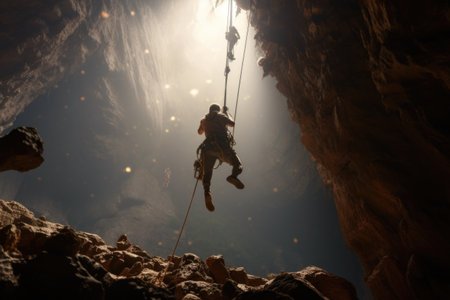 A man is seen hanging from a rope inside a dark cave. This image can be used to depict danger, adventure, or a challenging situation.