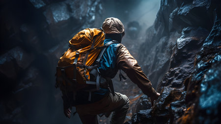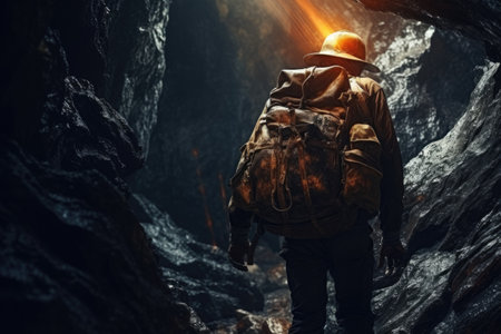 An AI generated illustration of A person stands in an underground cave with a backpack strapped to their back, illuminated by a bright light source