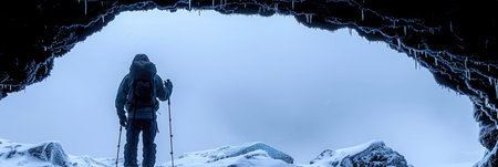 A hiker equipped with trekking poles surveys the frozen terrain from within a cave opening.