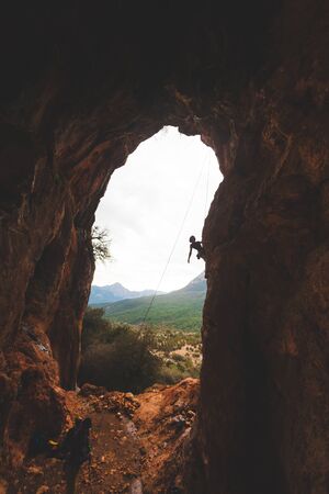 A man climbs the rock against of a mountain landscape. The athlete trains on a natural relief. Climbing in Turkey. Rock in the form of an arch. Cave. The climber overcomes a difficult route.