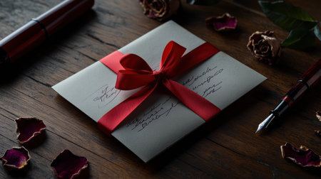 A vintage love letter tied with red ribbon on wooden table