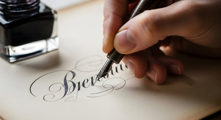 A close-up shot captures a person's hand skillfully writing in elegant, cursive script with a classic fountain pen. The nib of the pen glides across the paper, creating beautiful calligraphy, with a glass inkwell visible nearby. The image evokes a sense of tradition, craftsmanship, writing, and artistry.