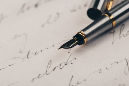 Fountain pen on an ancient handwritten letter. Old story. Retro style.