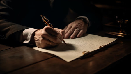 Elderly man signs documents in a luxurious courtroom, dressed formally, suggesting wealth, legacy, and legal affairs.
