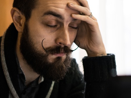 Modern, Expressive Bearded Office Clerk with Mustages Bored to Work in Office