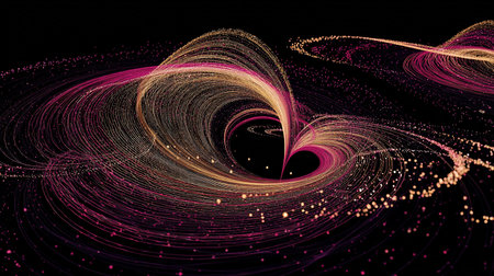 This abstract digital artwork presents a series of flowing lines. The composition features curving forms against a dark background, creating a dynamic visual effect. The piece makes use of color to highlight the lines. Suitable for use in various design projects and as visual elements in web design or editorial applications.