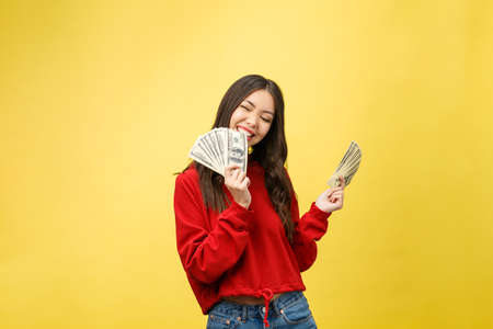 Closeup of young beautiful woman with us dollar money in hand over yellow background, with copy space