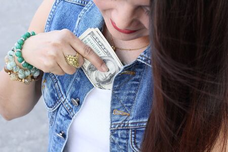Close up hand of businesswoman holding banknote into pocket. Profitable investment. The exchange of currencies. Money to buy debt securities increase revenue. Hand puts dollar bills in the pocket jeans. The concept of giving a bribe