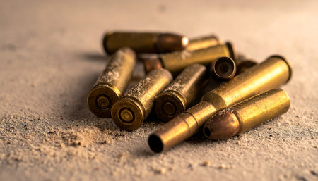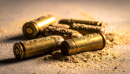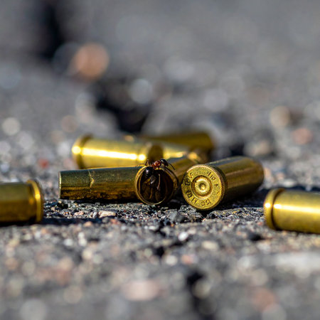 Empty brass bullet casings lie scattered on the rough asphalt, the silent and chilling evidence left behind after a violent event. This powerful image captures the immediate aftermath of a crime or conflict, perfect for illustrating themes of law enforcement, investigation, and the consequences of gun violence.