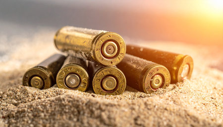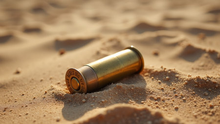 Desert battlefield with bullet casing in sand reflecting midday sun