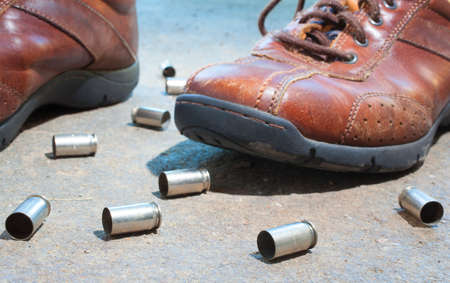 Empty handgun casings that are next to a pair of shoes