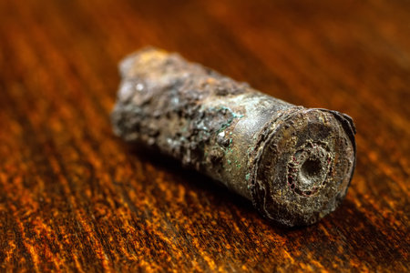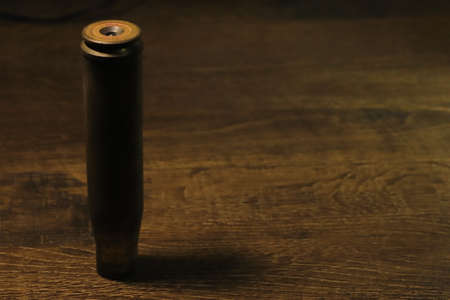 Rusty gun case on a wood background. An old cartridge case from a gun cartridge found in the ground.