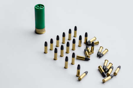 Scattered bullets on a white background. Concept of ammunition, firearm safety, military gear, crime investigation.