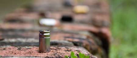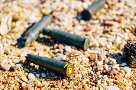 Ammunition on the sand. Selective focus. Shallow depth of field