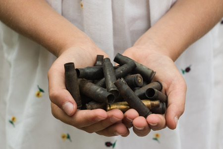 Little girl holding rifle bullets shell in her hands close up.