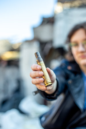 Woman holding rifle bullet shell in hand. War in Ukraine. Concept of war in Ukraine.