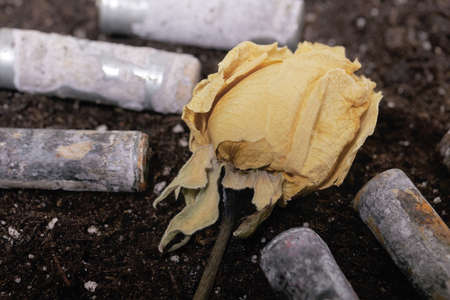 Corroded batteries covered with earth. Dried rosebud. Environmental protection and waste recycling. Close-up shot.