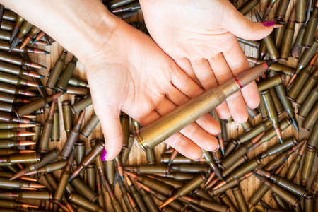 Cartridges lie in a box, a womans hand holds a live cartridge on the background of bullets, military weapons, war in Ukraine