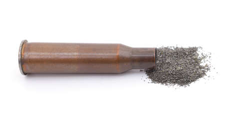 Cartridge case and a pile of gunpowder isolated on a white background.
