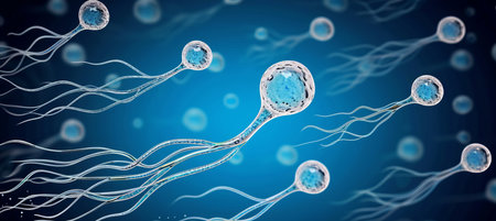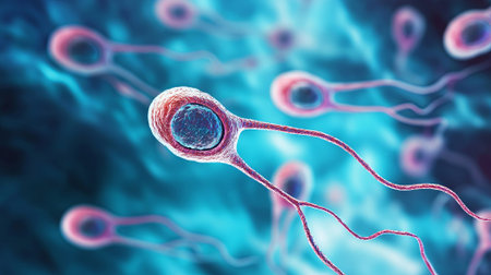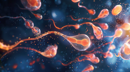 Detailed depiction of sperm cells in motion within a fluid environment, highlighting their distinct forms and dynamic movement, symbolizing reproductive processes, AI generated