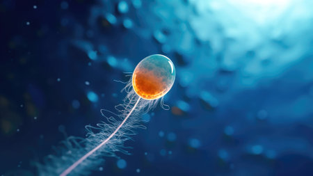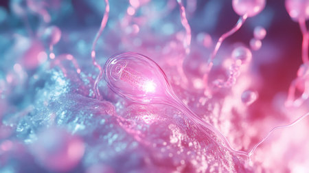 A vibrant depiction of a sperm cell illuminated with glowing tendrils, floating in a dark setting, highlighting intricate details and vibrant colors.