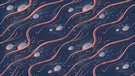 Active sperm swim on a blue background. The concept of pregnancy, fertilization of the egg. Top view