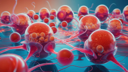 Abstract representation of biological cells with interconnected structures, showcasing vibrant red and blue tones. Conceptual depiction of cellular activity and science.