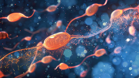 Detailed depiction of sperm cells in motion within a fluid environment, highlighting their distinct forms and dynamic movement, symbolizing reproductive processes, AI generated