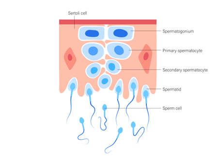 Cross section Human testis under microscope view. Shows spermatogonia, spermatocytes in meiosis, spermatids, and spermatozoa