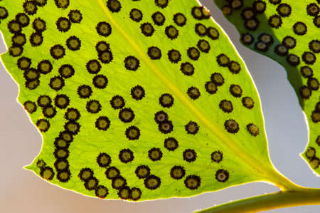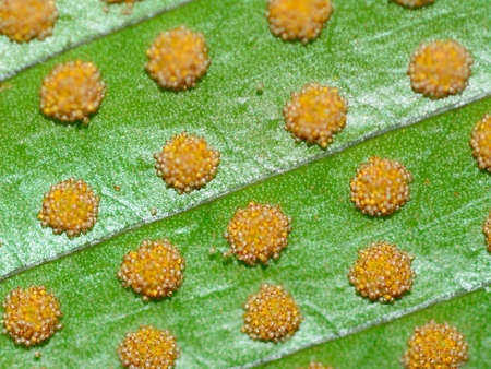 Green fern leaf texture with red dot of spore sacs overlapped by another leaf