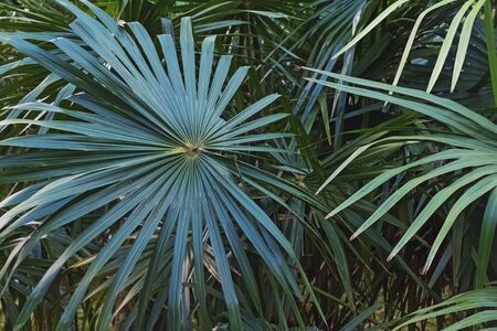 Green tropic big palm leaves close-up