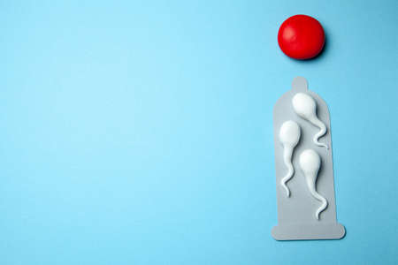 Spermatozoa in the condom and the cell, preventing fertilization. Contraceptives against pregnancy, safe sex from genital tract diseases or AIDS. Copy space for text