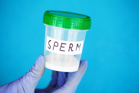 Health. Sperm Analysis. Concept of Bank Sperm. Infertility. Doctors Hand Holding Container for Analyzes