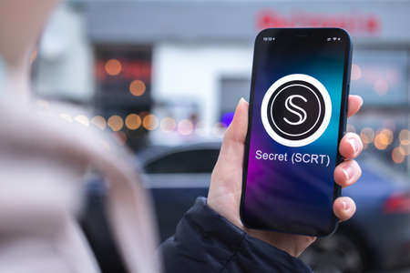 Kharkov, Ukraine - February 2, 2022: Secret SCRT coin symbol. Trade with cryptocurrency, digital and virtual money, mobile banking. Hand with smartphone, screen with crypto icon close-up