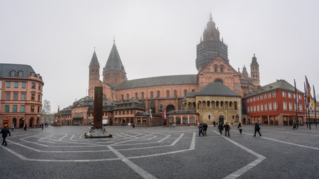 Mainz, Germany - Jan 22, 2020: Panoramic view of Marktplatz Square with Cathedral and Heunensaule Column on a foggy day - Mainz, Germany