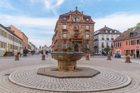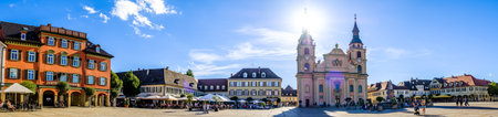 Market square with town hall and town hall tower, Ettlingen, Germany, Black Forest, Baden-Wuerttemberg, Germany, Europe. Downtown of Ettlingen town in Baden Wurttemberg, Germany.