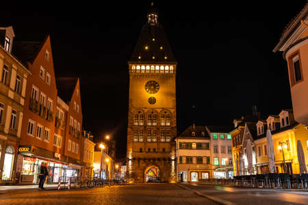 Speyer, Germany - Mar 14, 2020: The Old Gate Altpoertel in Speyer, Germany at night. It is the medieval city gate. It is one of the original 68 towers in the old walls and gates of the city.