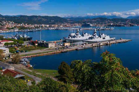 Aerial spring view of port of La Spezia city. Sunny morning scene of Mediterranean sea, Liguria, Italy, Europe. Magnificent Mediterranean landscape. Artistic style post processed photo.