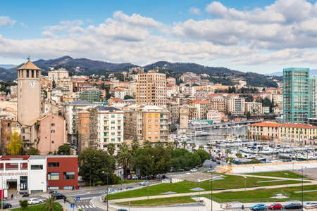 Savona, Italy - December 2, 2016: Cityscape with the marina and Brandale tower viewed from the Priamar fortress in Savona, Liguria, Italy.