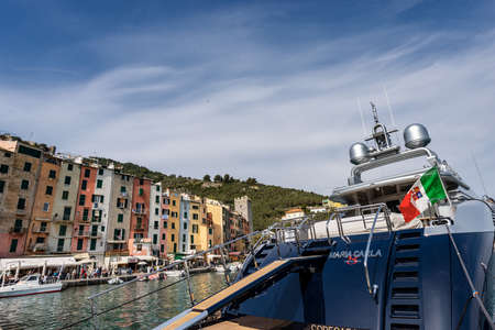 PORTO VENERE, LIGURIA, ITALY - MARCH 25, 2016: Luxurious yacht in the port of Porto Venere or Portovenere, UNESCO world heritage site, Gulf of La Spezia, Italy, Europe