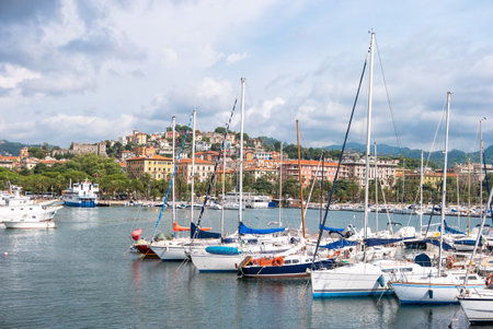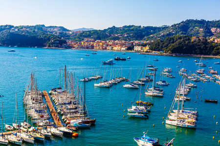 Top view on a harbor with moored sea ships, yachts and sailboats in Ligurian Sea. Santa Margherita Ligure is an italian riviera near Portofino and Genoa.