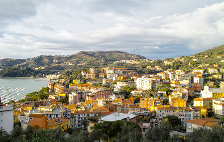 Traveling around the ligurian seaside. Panoramic view to the seaside and the old villages. An amazing caption of the medieval colored houses with gray sky.