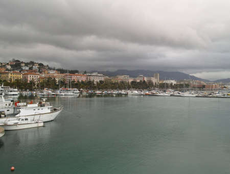 Sun rays shining through the clouds over a port in the Mediterranean sea. Sanremo, Italy