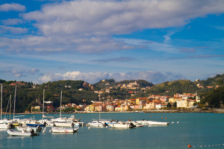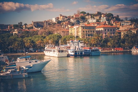 Beautiful landscape of La Spezia with bright Italian houses and palm trees. View of the city port on the shores of the Ligurian Sea with boats in the foreground.