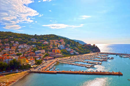 Aerial view of the port of Lerici town with many recreational boats moored, Tourist resort on the coast of Gulf of La Spezia, Liguria, Mediterranean sea (Ligurian Sea), Italy, Europe.