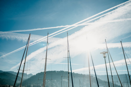 A low angle shot of boat masts under the sky with jet trials