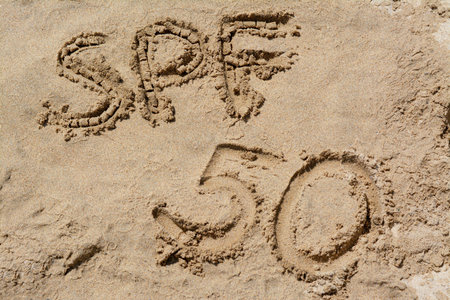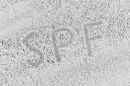 Sign and symbol of the sun protection factor on the white beach sand. Spf concept.