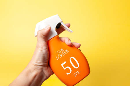 Cosmetics SPF for face and body on yellow background. Top view, flat lay.