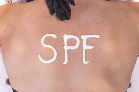SPF word made of sunblock at woman's back at the beach. Sun protection factor concept.