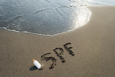 Sun protect factor concept. SPF word written on the beach with question mark.